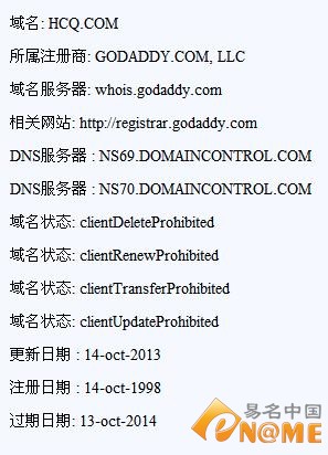 据whois查询,域名hcq.com在1998年10月14日就已注册,在今年10月14日变更过域名信息,其他相关主流后缀域名也均早已注册。